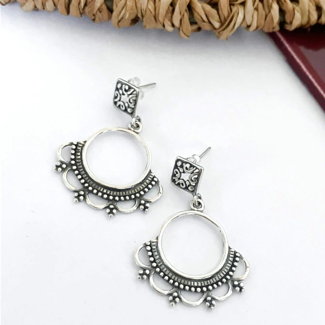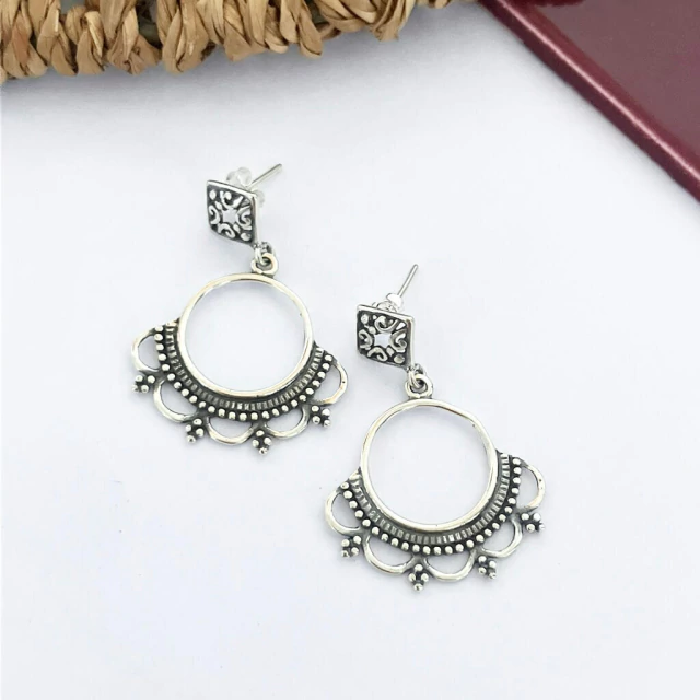 Os brincos em prata oxidada são conhecidos por sua durabilidade e resistência, além de proporcionarem um visual vintage que está sempre em alta. O detalhe em pontilhismo adiciona um charme especial, tornando cada brinco uma obra de arte única.